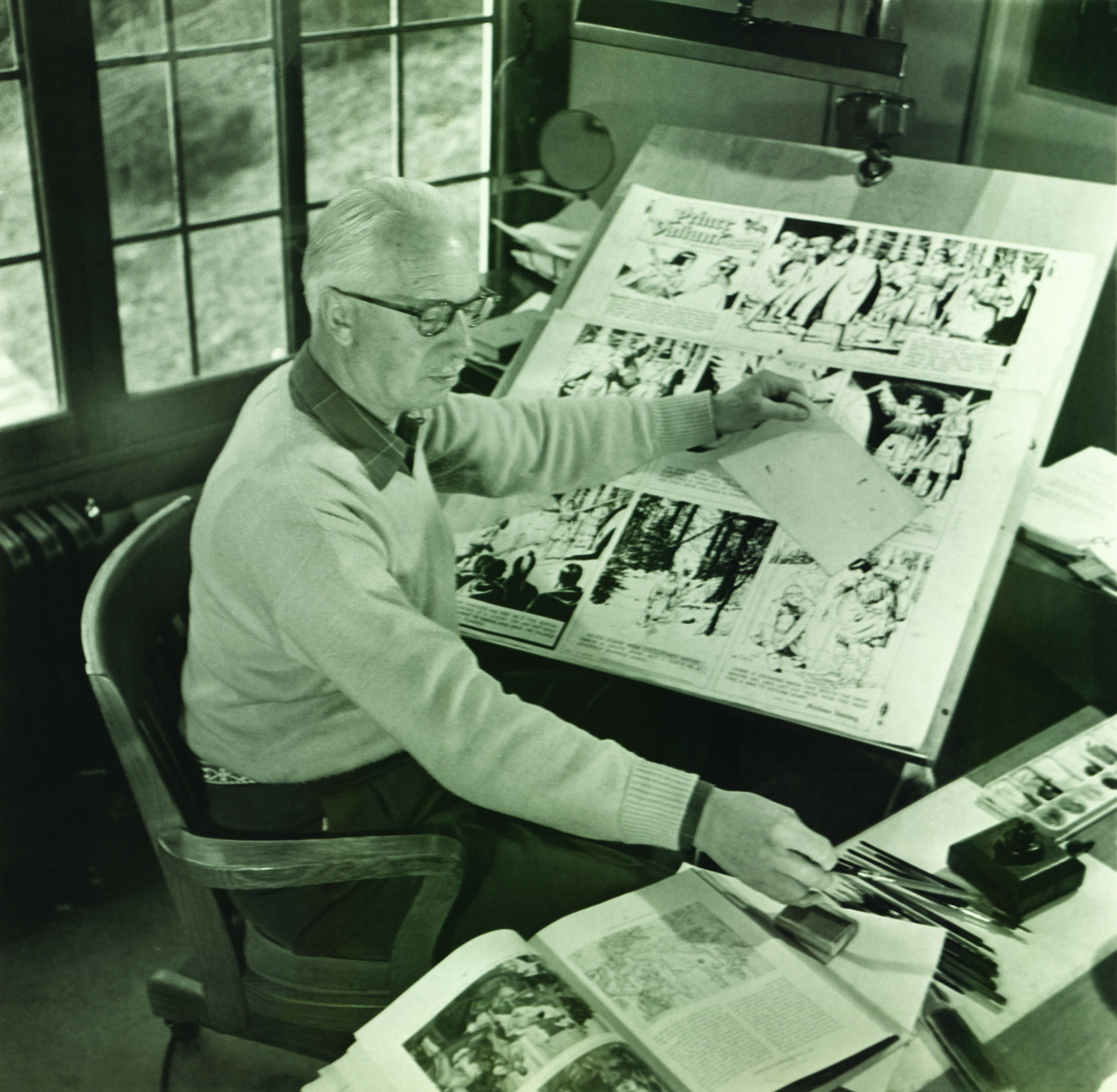 Before television, when most films were still black and white, the Sunday comics were an oasis of color in a Depression-era gray world. Highly popular comic strips drove newspaper sales in the early 20th century, so it is little wonder that their creators were regarded as celebrities. The epic Prince Valiant in the Days of King Arthur by Harold Rudolf “Hal” Foster premiered in the color comics section on Feb. 13, 1937. Prior to Prince Valiant, Foster originated the adult-protagonist adventure strip genre by adapting Tarzan as a black and white daily strip in 1928, which was followed by the Tarzan color Sunday feature from 1931-1937. Faced with imposing financial and creative constraints as a work-for-hire artist, Foster focused his considerable skills as an illustrator toward producing his own strip. The extraordinary effort resulted in international prominence for both Prince Valiant and Foster. Today, after 80 years, “Val” remains one of the few adventure strip characters still in print.